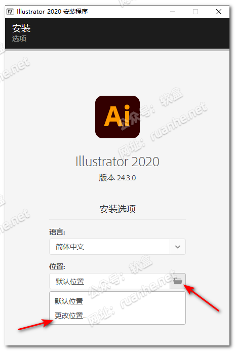 点击【文件夹图标】,然后点击【更改位置】默认安装在C盘,不推荐安装在C盘。
