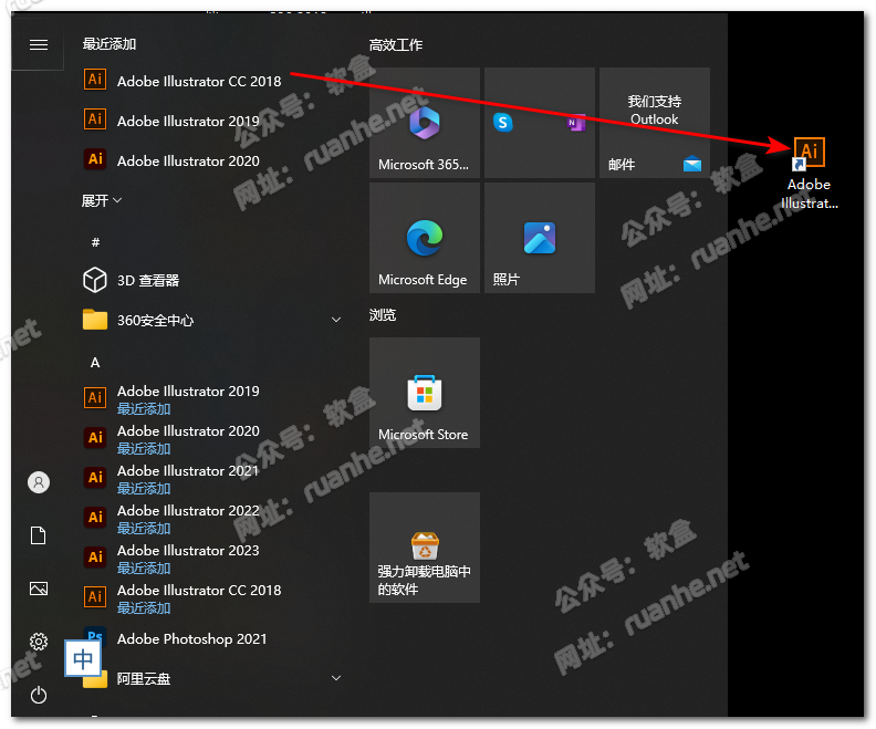 安装完成之后,桌面是没有软件图标的,你需要返回桌面,打开开始菜单,找到【Adobe Illustrator 2018】,左键按住不放,拖动到桌面。