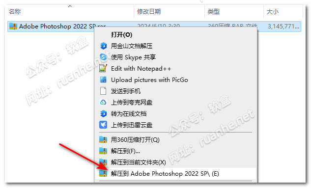 右键单击【Adobe Photoshop 2022 SP】压缩包(若使用win11系统,请先点击“显示更多选项”),然后选择【解压到Adobe Photoshop 2022 SP】。