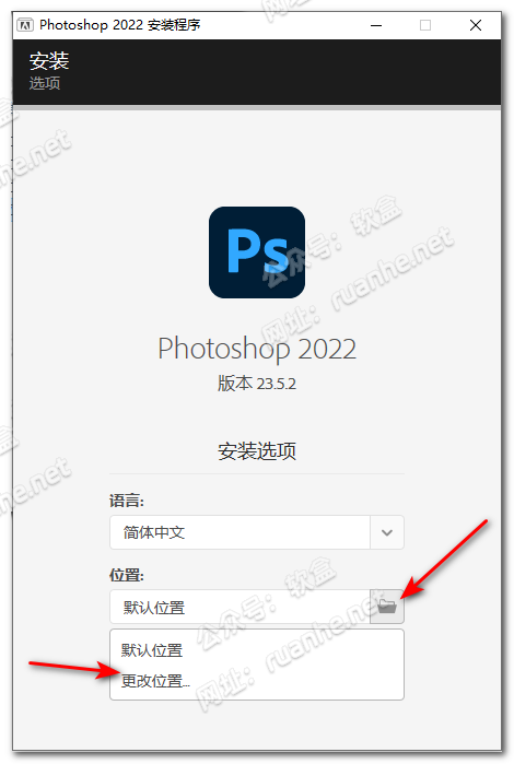 点击文件夹图标,接着点击【更改位置】按钮,可以修改安装的路径,不推荐安装在C盘。